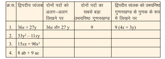 किसी द्विपदीय बीजीय व्यंजकों का गुणनखण्डन पदों के म.स. को उभयनिष्ठ निकालकर किया जाता है।